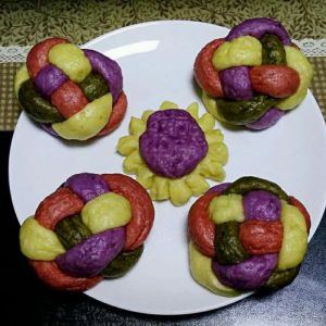 因为主要是介绍绣球花的编法,发面的过程就不再介绍了,我用了四种颜色,分别是加了抹茶,玉米粉,红曲粉和紫薯的面团