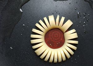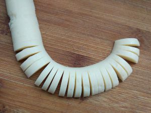 将香肠切去两边圆头,如图切开,一边相连不切断。因为香肠很软,拖刀的话会扯断,最好一手捏着一手用小刀切