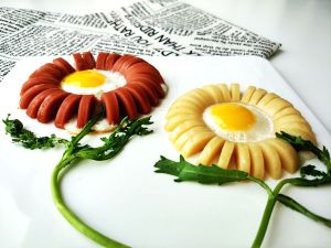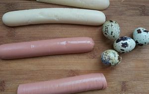 香肠去皮,从中间纵向剖开。准备几个生的鹌鹑蛋