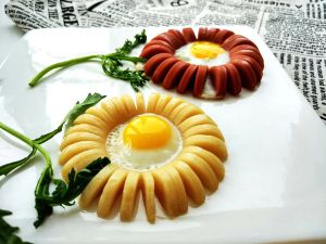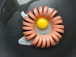 红色香肠也是如此处理。如果锅底不热,打入鹌鹑蛋后,底部不能马上凝固,会流到香肠外面去的
