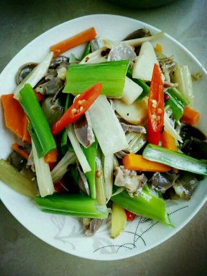 1.热锅放油,油热放姜大蒜花椒爆香,再放酸菜翻炒出味,接着放鸡胗,翻炒一下放盐,酸菜本身有点咸,所以注意盐的用量,尽量多炒一会,让鸡胗入味,接着放大葱叶段,翻炒一下放糖,鸡精,味精,翻炒均匀起锅,就好了