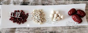 原料:红豆,薏米,莲子,红枣。其中红豆与薏米2:1,其余少许。
