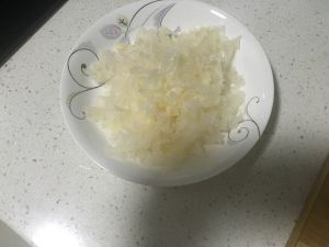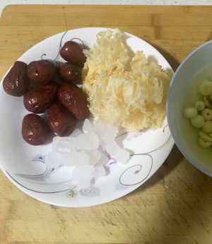 准备好材料,把银耳泡发,提前一两个小时用凉水或温水泡发