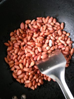 小火,凉油50克就行,倒进花生米,一定要来回翻炒着,让花生多粘上油,火必须小火,火大了容易烧焦了也不熟