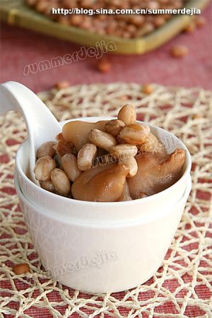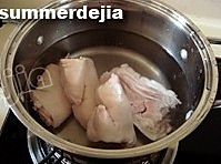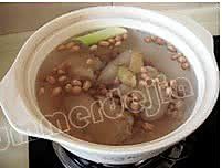砂锅中的水烧至将要沸腾时,放入飞过水的猪蹄,洗净的花生,葱、姜片、料酒,大火煮开,撇净剩余的浮沫,小火继续煮两三个小时;