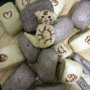 香喷喷的大馒头就出锅了。我拿可可粉在上面随便画的。为的是让女儿多吃一口馒头。