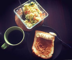 用勺子按成泥,把鸡蛋煮熟,蛋黄和土豆泥按在一起,放入胡萝卜和黄瓜,蛋清,胡椒粉,沙拉酱,拌在一起,完成