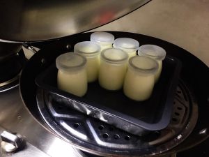 隔水蒸10分钟关火,不要打开锅盖,用余温再焖10分钟。这里切记别把盖子放进去,会变形,我们的盖子全废了。
