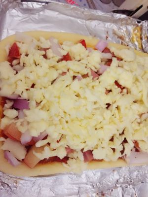 披萨面饼平铺炒好的披萨酱铺一层芝士条(约60g)