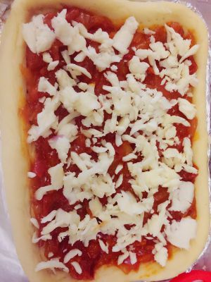 所有面团用料➕40g水➕10g油揉成光滑面团,温暖地方发酵至两倍大,排气揉至披萨形状,叉子叉些孔孔(排气)放入烤盘