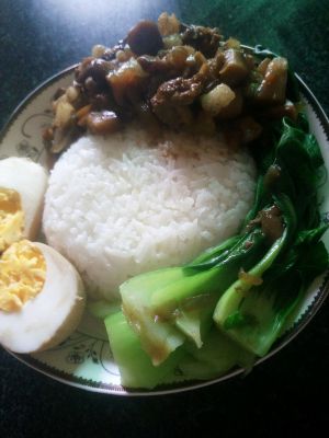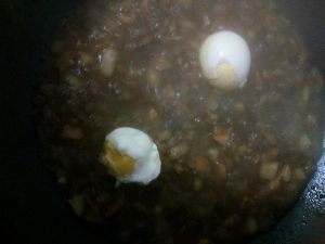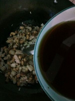 肉炒至发白,倒入泡香菇的水。记得过滤,不然有渣啊!加蚝油酱油盐料酒调味。味道比例自己可以尝,没有一定之规。