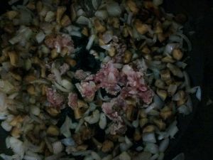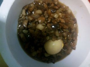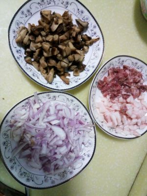 洋葱切丁,干香菇泡发挤干水切丁,肥肉切丁,瘦肉剁成肉末