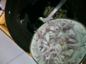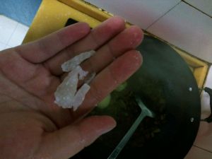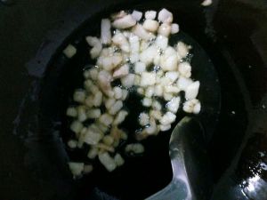 放一点儿油,下肥肉丁煸炒至出油,焦黄。