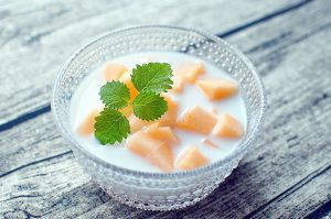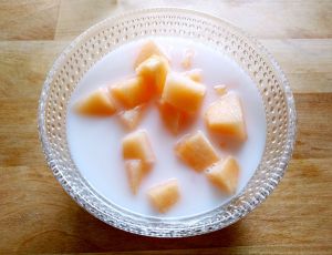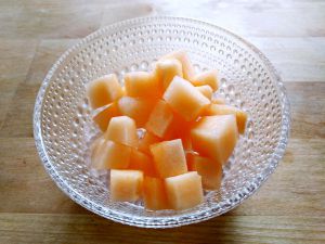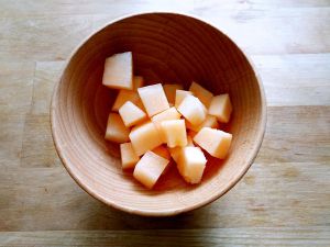 准备上述食材。烧一锅开水。哈密瓜切丁。