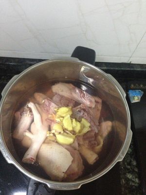 高压锅内放进适量水 各种鸭肉块 放姜片