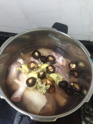 干蘑菇 干蛏子 干鱿鱼干 洗净 放入高压锅内 盖锅盖 大火煮