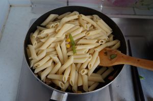 转小火翻炒至蔬菜变软塌,放入通心粉翻炒。