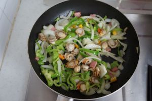 放入扇贝肉,中火继续翻炒至变色,放入火腿碎(我在等面的时候又剥了点玉米粒 哈哈真是闲的 大家根据口味爱好选择哈~)