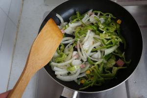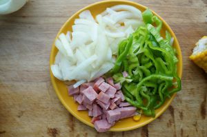 煮面期间准备所需蔬菜,洋葱切丝,青椒切丝,火腿切小块