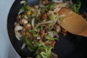 油热后,先放蒜瓣爆香,一直保持大火,放入青椒丝洋葱丝翻炒,炒3分钟