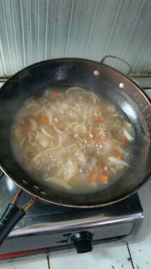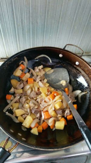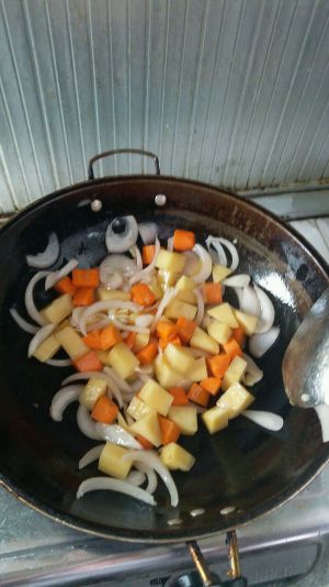 先用大蒜炒香油锅,再入洋葱,胡萝卜和土豆翻遍3分钟左右,起锅待用