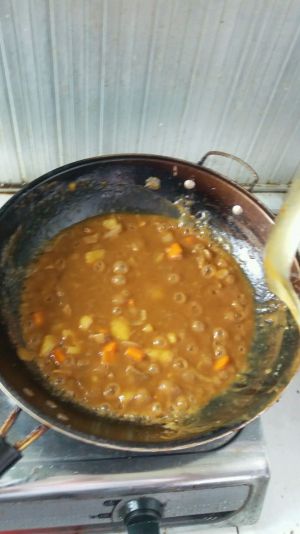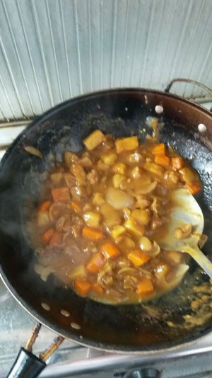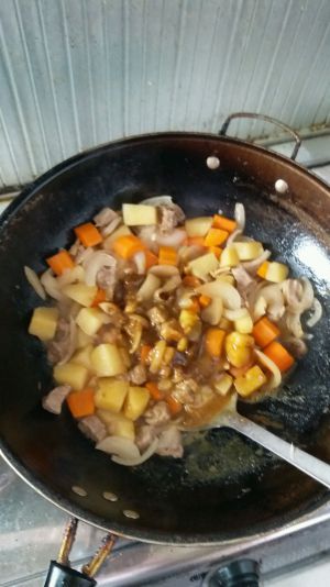 煮15分钟盖锅盖,注意观察食物是否粘锅,10分钟左右开始加咖喱块,酌情加水,尽量多一点汤汁!