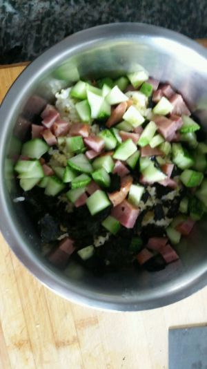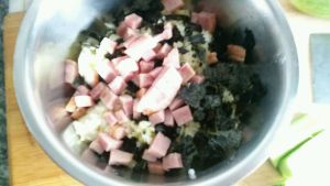 加入火腿丁和海苔,推荐用那种碎的成罐的海苔,我第一次做用的波力海苔还得自己撕碎
