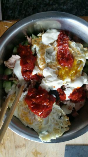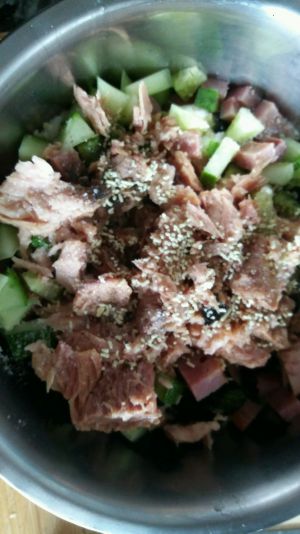 加入金枪鱼罐头,沙拉酱,鸡精,盐,黑胡椒,注意用量,一个金枪鱼罐头搭配的米饭