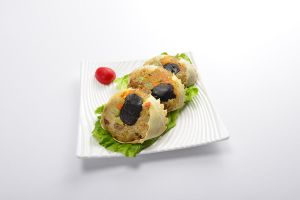 ①烧热油锅,爆炒切成小丁的香菇、虾米、笋丁、火腿、花生米等,并淋酒放入酱油与盐调味,再加入上汤1杯煮滚。熄火后将煮好之糯米饭加入,拌合均匀。月亮虾饼