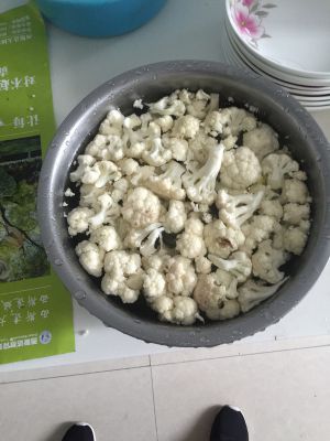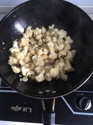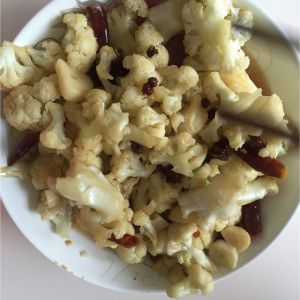 锅热后先放油,然后将切好的蒜,花椒,八角,辣椒一切偏炒,再讲洗干净的花菜放进锅,小火炒,炒两分钟酱油上色,在放点适量的盐。