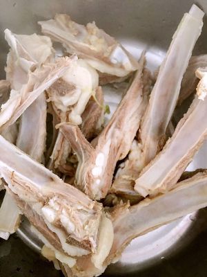 这次羊排我选择开水煮一下,去除血沫子后,放入葱姜蒜,花椒,盐,少量料酒大火煮10分钟左右,沥干水。
