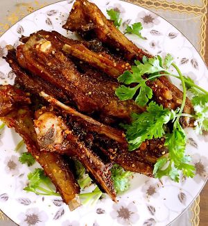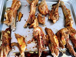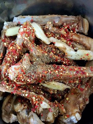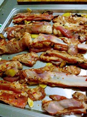 羊排洗净切条。(如果直接烤,可以放入葱姜蒜,花椒,孜然粉,辣椒粉适量,料酒少量,酱油提色,适量盐,最后放入植物油包住水分和味道,腌制时间随意,最好1小时以上。)