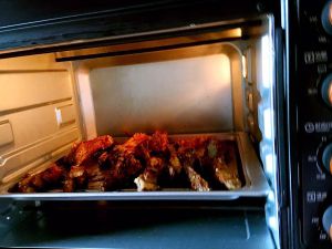 准备好的羊排条均匀放在烤盘上,把腌制的调料汁均匀的倒在羊排上,可以烤了。