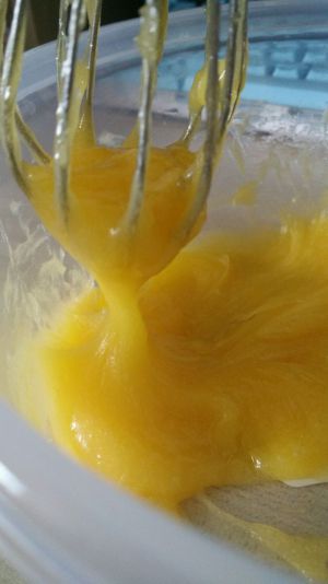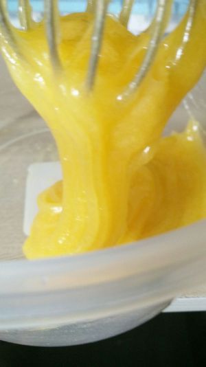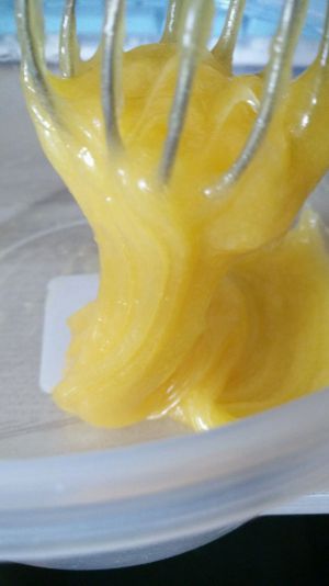 继续加到70g,可以用搅拌器把全部蛋黄提起,这时感觉搅拌阻力大,可以添加白醋