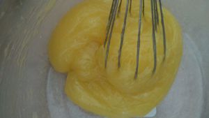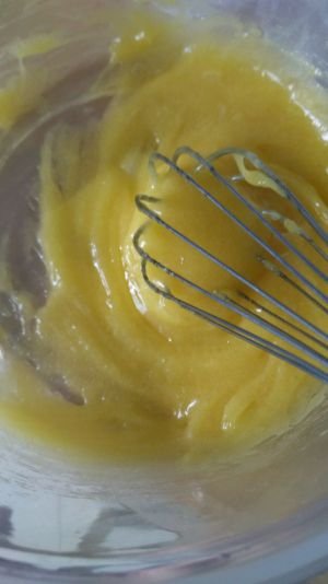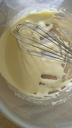 随着玉米油的添加,蛋黄糊越来越稠,如果越搅拌越稀,说明你已经失败,补救方法是重新取个蛋黄,把失败的蛋黄糊当玉米油分次少量加入。