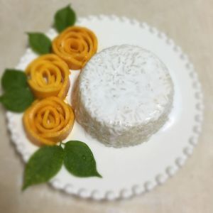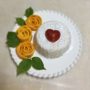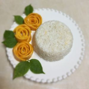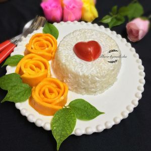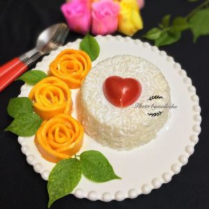 芒果去皮切薄片,放入盘中摆成玫瑰花状(忘记拍照了),将糯米饭整形好倒入盘中。
