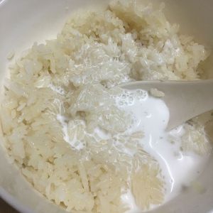 煮好的糯米饭盛入碗中,倒入椰奶,留少许稍后淋表面,搅拌均匀。