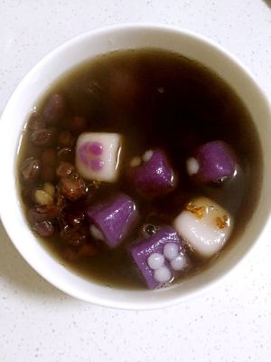 将五彩圆子煮熟放了红豆桂花汤中即可食用。