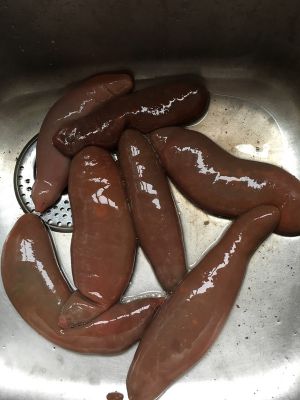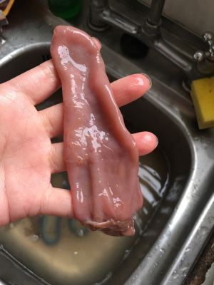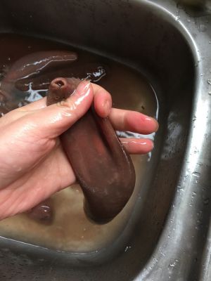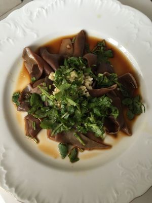 煮一锅水,水开后下海肠烫15秒出锅,然后切小条,1公斤洗好烫好就这么点……不够塞牙缝……加生抽,麻油,蒜末,少许盐提味。最后香菜点缀即可,味道不错,脆脆的