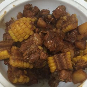 倒入油,七八分放入葱姜蒜,爆炒,然后倒入控干水的排骨,翻炒一下,倒入切好的玉米,倒入刚才调好的汁,我用了一半,等中间的时候再全部倒入。炒几分钟,加入热水,没过排骨和玉米,盖上锅盖。大火先炖15分钟。