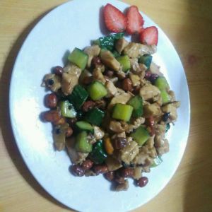 坐锅点火放油,油热可以加花椒和辣椒,然后放葱姜蒜煸炒下,加入鸡肉翻炒,接着加入适量的酱油,醋(如果粘锅可以淋点水),快熟时加入黄瓜丁翻炒几下,(看情况可以再加点盐),关火后放入炸好的花生米,搅匀即可入盘