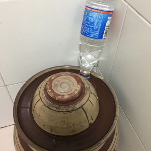 然后把花椒和蒜放进坛子里,最后加入调好的盐水,淹过蒜就行,盖上盖子,外面加水米饭,矿泉水瓶是我经常不在家,怕水干了,补充的,新蒜做的盐水很香,半个月后就特别像,可以加入辣椒和姜等喜欢吃的东西,完成
