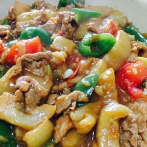 然后再放西红柿和青椒,翻炒一会,放入调好的汁,再放些香油