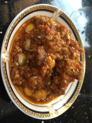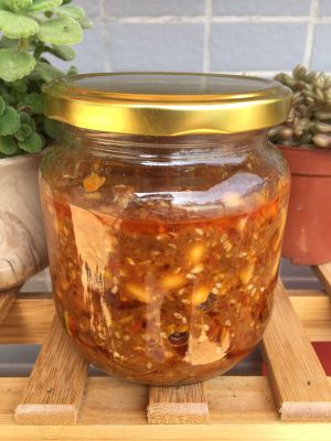 自己一个人做,没人帮忙拍照。这里文明说一下过程。1、适量冷油下蒜蓉中火炒出香味(热油会导致蒜蓉焦掉!切记)。2、下辣椒翻炒3分钟。3、下牛肉、黄豆翻炒。4、下鱼露、冰糖、白芝麻继续炒2分钟。5、补油(一开始下太多油炒,翻炒会逼不出来材料里面的水分,不耐放)。因为没放防腐剂,所以要油。补油盖过面,上面看见有微微一层油就可以了。中小火熬3分钟就可以关火,等凉了就可以装瓶。