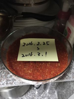 1、辣椒搅碎.2、苹果磨成苹果泥.3、加盐.4、洒白酒在面上。密封好发酵。冬天要5天,夏天要3天。盐会导致辣椒停止发酵,所以加苹果泥才会发酵,白酒洒在面上是为了不被酸坏掉。