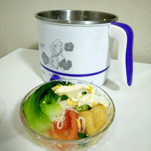 4、换锅水放入面条,切好的西红柿和油豆腐,加入调料,适量盐,水滚开后打入鸡蛋,放入豆芽,撒葱花。