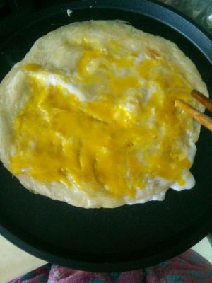 再把鸡蛋涂满均匀,这样其实鸡蛋差不多就半熟了比较利于翻面