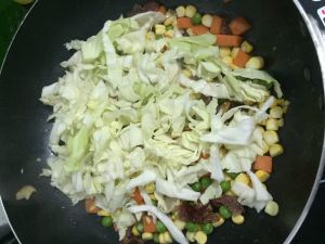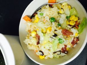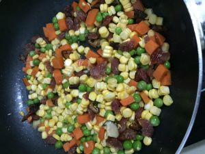 加盐酱油调料后就可以加入饭炒均匀,这样一碗混合多种蔬菜的炒饭就诞生,一次满足多种需求✺◟(∗❛ัᴗ❛ั∗)◞✺