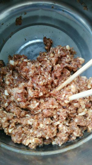 调料水内加白糖半勺、生抽1勺,倒入肉馅中,顺时针拌匀。