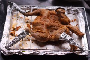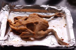 把腌制好的鸡拿出来,擦干鸡身上的腌料,用吹风机吹干鸡身的表面;